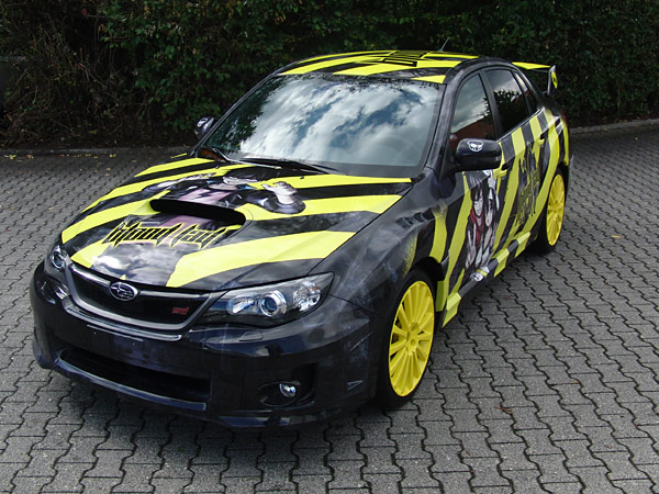 Auf der IAA in Frankfurt gibt es noch bis zum 22. September in in Halle 8.0 (Standnr. D20) einen Subaru WRX STI-Sportwagen im BLOOD LAD-Design zu sehen. Die Karosserie ist im typisch schwarzgelben Design gehalten, auf Türen, Motorhaube und Heck sind Staz, Fuyumi und weitere Figuren zu sehen. Auch im Cockpit hält man sich an das Thema und hat auf den Kopfstützen eingestickte Totenköpfe. Probefahren kann man das gute Stück natürlich nicht, reinsetzen ist aber möglich.