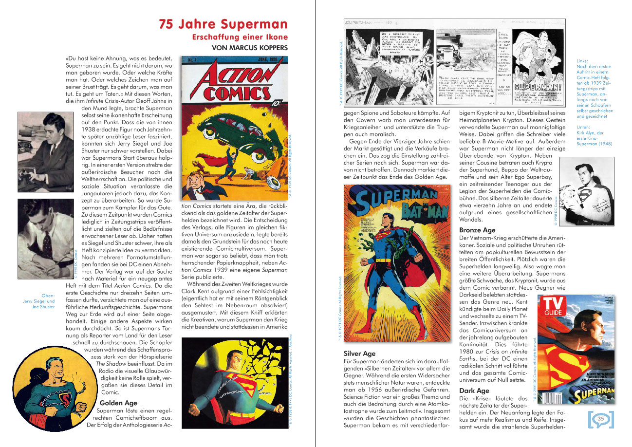 2013 war ein besonders ereignisreiches Jahr in der Comicszene, was Jubiläen und Geburtstage von Comichelden betrifft. So feierten im vergangenen Jahr mit dem US-amerikanischen Superheldenepos Superman und der belgischen Comicserie und dem Magazin Spirou gleich zwei Schwergewichte ihren 75. Jahrestag. Während »der Stählerne« in einem umfassenden Rückblick auf seine Karriere gewürdigt wird, haben wir die Lebensgeschichte des abenteuerlustigen Hotelpagen Spirou zu unserem Titelthema auserkoren.
