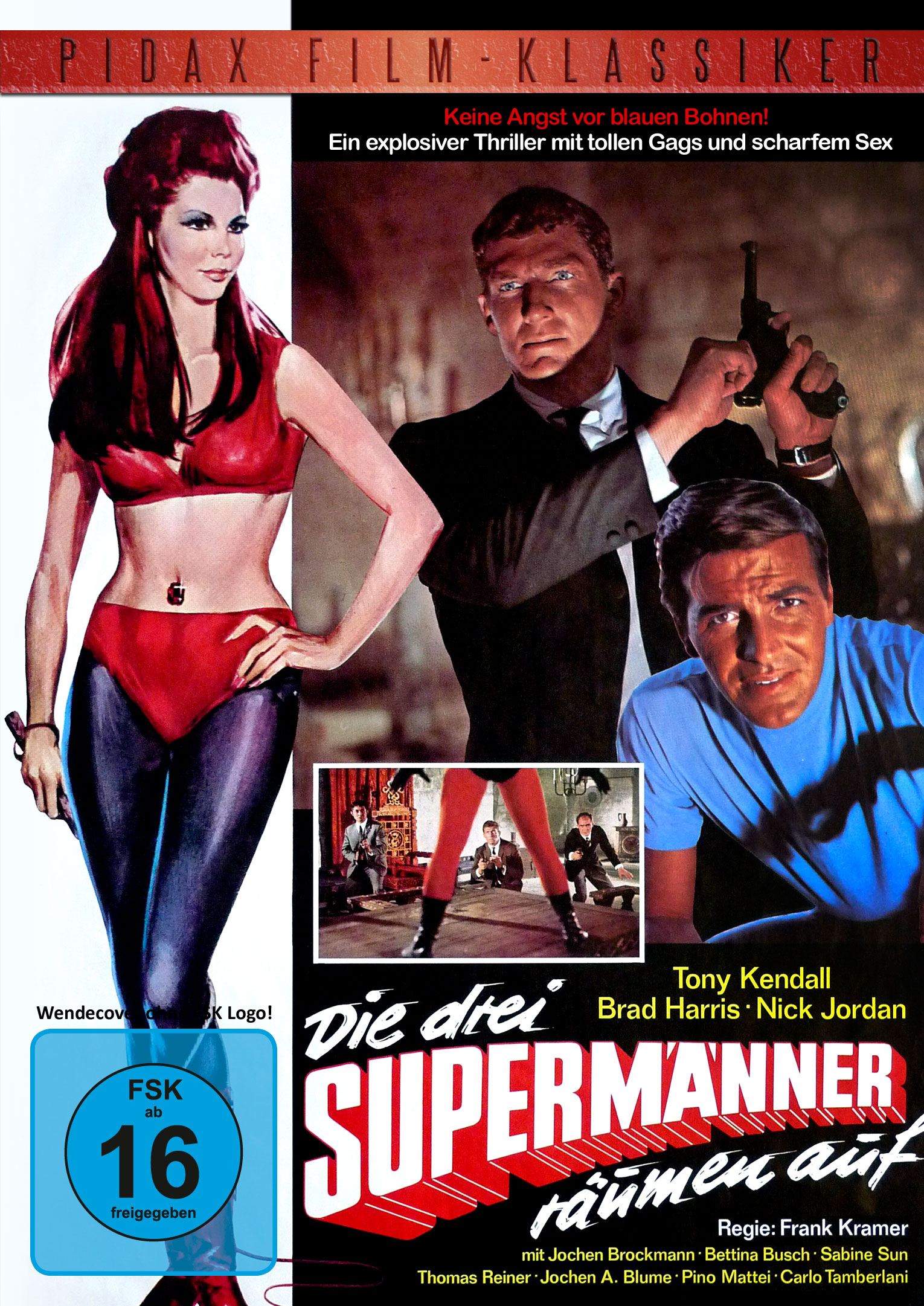 Mit „Die drei Supermänner räumen auf“ gibt es eines der spaßigen Abenteuer der drei Supermänner. Neben den Kommissar-X-Stars Brad Harris und Tony Kendall agiert der Zirkuskünstler Nick Jordan als „fliegender Superheld“. Bei solchen Supermännern wird den Gegnern, Polizisten wie Gangstern, schwindelig. Die „Universal-Repro-Maschine“ eines Golems, der die Welt erobern will, wird in atemberaubenden Aktionen ausgeschaltet. Eine Actionszene folgt der anderen. Kämpfe, Explosionen, hübsche Miezen und dazu drei fliegende, lustige Supermänner. Für die leichtfüßige Gestaltung der Geschehnisse im Stile eines Comicstrips zeichnet der bewährte Kommissar-X-Regisseur Gianfranco Parolini aka „Frank Kramer“ verantwortlich. Hauptdarsteller Brad Harris attestiert ihm wie auch allen drei Hauptdarstellern bei diesem Film eine „sehr kindliche Fantasie“, und alle durften sich einmal richtig austoben. Die Fans kommen voll auf ihre Kosten.