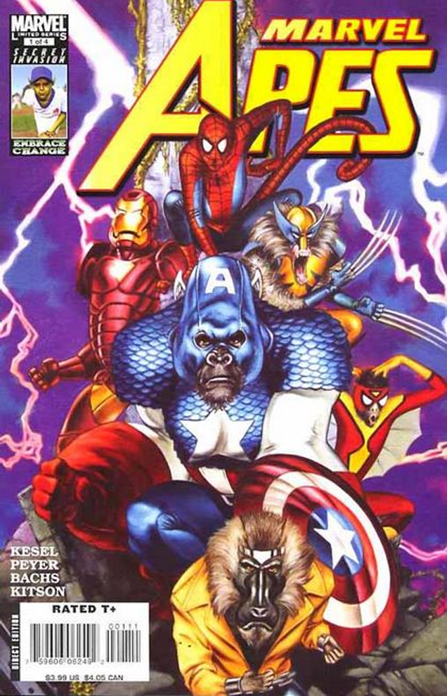 Viele irre Cover sind ja aus längst vergangener Zeit, aber auch heutzutage gibt es noch recht Kurioses. Nach den Pet Avengers und den Marvel Zombies präsentierte Marvel im Zuge von Secret Invasion auch die Marvel Apes!