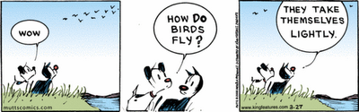 McDonnells Humor ist sehr angenehm, weniger zum Schreien komisch als vielmehr zum Schmunzeln schön. Dabei propagiert McDonnell auf unaufdringliche Art und Weise ein grünes Lebensgefühl, dass man auf Tiere und die Umwelt achten und beides nicht ausbeuten sollte. Die Botschaft ist schön, aber nie mit dem Holzhammer dargelegt. MUTTS, das von Charles Schulz in den höchsten Tönen gelobt wurde, ist einfach ein toller Strip für Tierliebhaber.