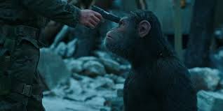 Des Weiteren gibt es zwei Sequenzen, die interessant sind. In einer sind Caesar, Maurice, Rocket und ein Gorilla unterwegs, weil sie nach dem von Woody Harrelson gespielten Colonel suchen. Als sie auf einen Menschen treffen, der zu seiner Waffe greift, erschießt Caesar ihn. Maurice findet daraufhin das stumme Mädchen des Mannes und beschließt, es mitzunehmen. Die Sequenz zeigt sehr schön, dass Caesar nach zwei Jahren des Kampfes – so viel später nach dem zweiten Teil setzt dieser Film ein – härter und kompromissloser geworden ist, dass er sein Mitgefühl aber noch nicht ganz verloren hat.