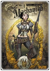 LADY MECHANIKA 1 (19,80 Euro) erzählt von einer Steampunk-Heldin, die weder ihren Namen noch ihre Vergangenheit kennt, aber über künstliche Arme verfügt, die ihr erstaunliche Kräfte verleihen. Darum ermittelt sie, was mit ihr passiert ist und gerät in einer Welt, in der die Maschinen eine neue Ära einleiten wollen, in allerhand Bedrängnis, schlägt sich aber, ohne die Waffen einer Frau einsetzen zu müssen. Von Joe Benitez geschrieben und gezeichnet, ist dies eine düstere Sci-Fi-Geschichte, die von spätviktorianischem Ambiente getragen ist.
