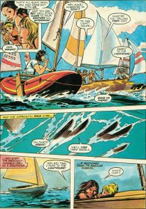 Anders ist, dass Brody selbst auf dem Boot der beiden Taucher ist, die gefressen wurden. Auf der Yacht findet man Drogen. Kurz darauf gibt es eine Szene, in der der Hai-Turm eingeführt wird und Peterson und Vaughn mit Brody sprechen. Was es nicht gibt, ist Brodys Panik mit dem Schatten im Wasser und den Schüssen, die er darauf absetzt. Im Comic ist es auch nicht nur eine Wasserskiläuferin und ihre Freundin. Hier sind es zwei Pärchen, wobei zwei auf Wasserkiern hinter dem Schnellboot hergezogen werden und zwei an Bord sind. Nachdem eine der Wasserskiläuferinnen gefressen wird, wirft einer der Männer eine Art Molotow-Cocktail auf den Hai, der verletzt auf das Boot zuspringt, woraufhin es zerstört wird und explodiert.