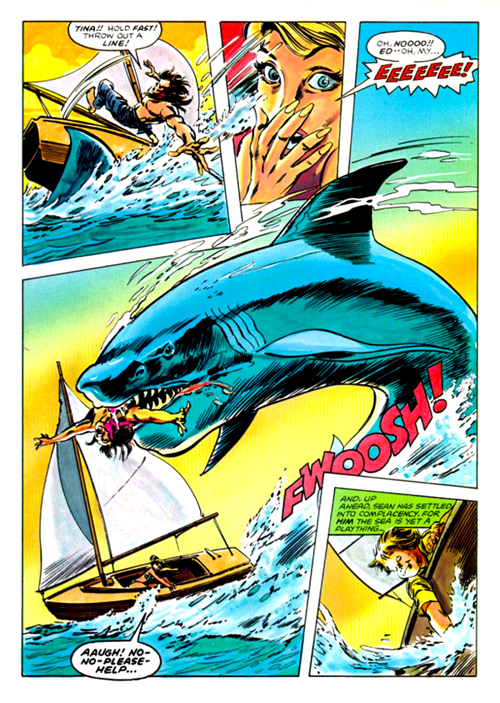 Anders ist, dass Brody selbst auf dem Boot der beiden Taucher ist, die gefressen wurden. Auf der Yacht findet man Drogen. Kurz darauf gibt es eine Szene, in der der Hai-Turm eingeführt wird und Peterson und Vaughn mit Brody sprechen. Was es nicht gibt, ist Brodys Panik mit dem Schatten im Wasser und den Schüssen, die er darauf absetzt. Im Comic ist es auch nicht nur eine Wasserskiläuferin und ihre Freundin. Hier sind es zwei Pärchen, wobei zwei auf Wasserkiern hinter dem Schnellboot hergezogen werden und zwei an Bord sind. Nachdem eine der Wasserskiläuferinnen gefressen wird, wirft einer der Männer eine Art Molotow-Cocktail auf den Hai, der verletzt auf das Boot zuspringt, woraufhin es zerstört wird und explodiert.