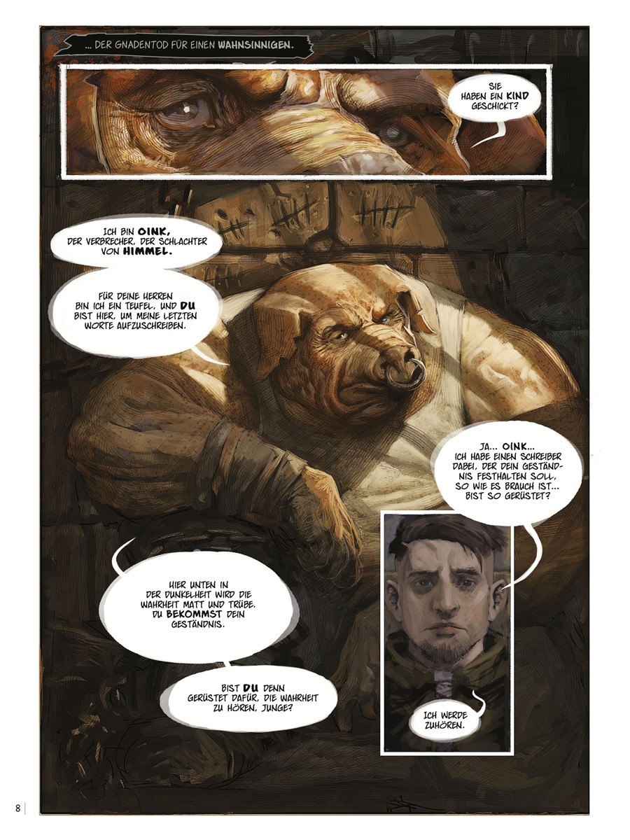 Bei Splitter ist einer der ungewöhnlichsten Comics der 1990er Jahre erschienen. Das zwar schon vor einiger Zeit, er ist es aber wert, auf ihn aufmerksam zu machen: OINK. John Mueller hatte über längere Zeit die Cover der Vertigo-Serie „Swamp Thing“ illustriert, als er sich daran machte, mit „Oink – Himmels Schlachter“ eine eigene Graphic Novel zu gestalten, die 1995 erstmals als Miniserie bei Kitchen Sink veröffentlicht wurde.