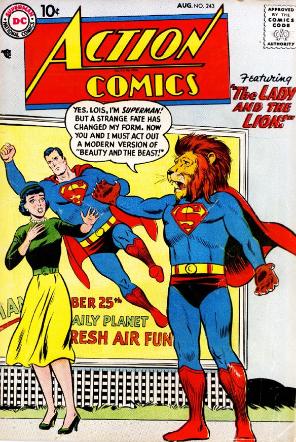 Bei DC hat man sich häufig ausgesprochen alberne Geschichten ausgedacht, so wie hier bei Action Comics. Das wirklich Famose ist jedoch Supermans Schlussfolgerung. Er ist jetzt ein Löwenmensch, da muss man natürlich nicht nach Heilung suchen. Nein, offenkundig muss man nun „Die Schöne und das Biest“ werden.