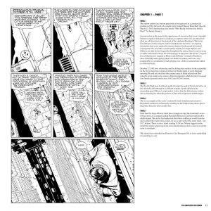 Hier ist der komplette Comic enthalten, zu jeder Seite gibt es aber Anmerkungen. Einiges geht dabei auf comicgeschichtliche Elemente ein wie Figuren, die als Inspiration für Watchmen-Charaktere dienten, anderes ist dann eher historischer Art. Und manches erscheint auch reichlich überflüssig, wie etwa die Erklärung auf Seite 55, was „the funny papers“. Auf derselben Seite wird dann auch noch erklärt, welche Bibelstelle der Priester bei der Beerdigung des Comedians vorliest. Anderes erscheint gegenüber dem Leser fast beleidigend, etwa, wenn erklärt wird, was MTV ist.