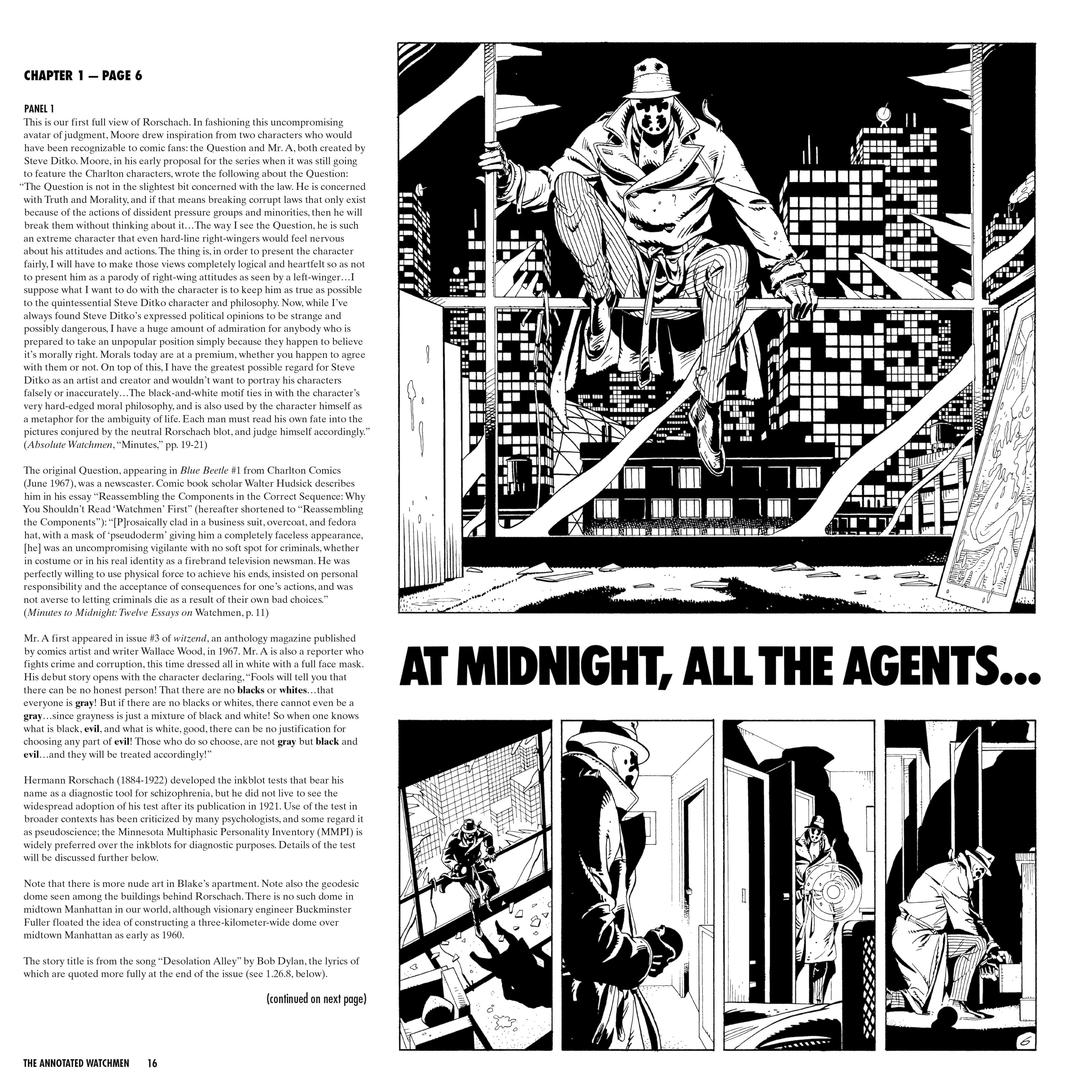 Hier ist der komplette Comic enthalten, zu jeder Seite gibt es aber Anmerkungen. Einiges geht dabei auf comicgeschichtliche Elemente ein wie Figuren, die als Inspiration für Watchmen-Charaktere dienten, anderes ist dann eher historischer Art. Und manches erscheint auch reichlich überflüssig, wie etwa die Erklärung auf Seite 55, was „the funny papers“. Auf derselben Seite wird dann auch noch erklärt, welche Bibelstelle der Priester bei der Beerdigung des Comedians vorliest. Anderes erscheint gegenüber dem Leser fast beleidigend, etwa, wenn erklärt wird, was MTV ist.