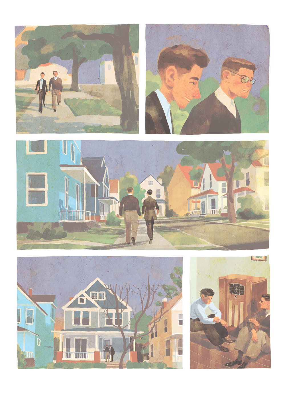 Die gut 160 Seiten starke Erzählung ist eine Biographie. Sie hakt die Lebensstationen des Künstlers Shuster ab, zeigt aber auch, wie sich Siegels Leben entwickelte – wenn auch durch die Augen des Freundes, der ihn teils über Jahre nicht mehr sah. Das ist alles ein wenig einfach gestrickt, weil die Narrative natürlich vorgegeben ist, aber Autor und Künstler schaffen es, diesen Comic nicht nur zu einer drögen Geschichtsstunde zu machen, sondern zu zeigen, wie skrupellos und unfair das Geschäft mit den bunten Comic-Heften wirklich war. Alle wichtigen Stationen werden dabei abgehakt, bis hin zum etwas schalen Happy End, das im Zuge von SUPERMAN – DER FILM kam.