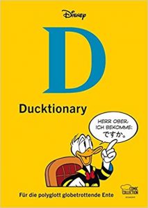 Für Donaldisten gibt es den DUCKTIONARY (20,– Euro). Ein trockenes Wörterbuch ist dies jedoch nicht, sondern vielmehr ein Sammelband unterschiedlicher Geschichten, in denen die Entenhausener in fremden Ländern unterwegs sind. Erklärende Texte gibt es dazu auch, am schönsten ist aber der Look des Buchs im Langenscheidt-Layout.