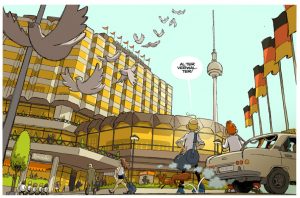 Die Ehre, diese Einladung in Comicpanels umzusetzen, fiel Flix zu – einem der erfolgreichsten und engagiertesten Comiczeichnern der deutschen Szene. Flix lebt und arbeitet in Berlin, und so war es naheliegend, seine „Spirou“-Erzählung in der geschichtsträchtigen Stadt spielen zu lassen. Flix hatte bereits mit der Comicstripreihe „Da war mal was…“ die Teilung Deutschlands und die DDR-Zeit zeichnerisch festgehalten – und in seinem „Spirou in Berlin“ kehrt er noch mal zu dieser Epoche der deutschen Geschichte, ins Ostberlin der späten 1980er, mitten in Stasi-Angst und das erste Aufbäumen der Friedlichen Revolution.