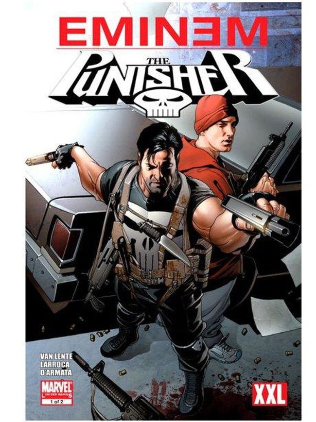 Eminem ist ein erklärter Marvel-Fan. So ergab es sich im Jahr 2009, dass jemand auf die grandiose Idee kam, ihn auch zur Marvel-Figur zu machen. Der Rapper ist er selbst, zieht aber in einer zweiteiligen Miniserie mit dem Punisher in den Krieg.