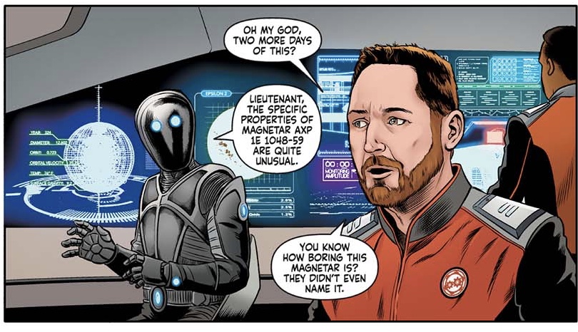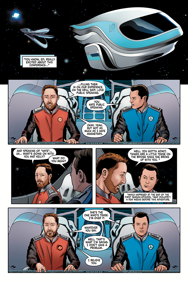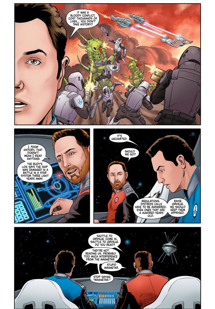 Das Cover erinnert dabei an die STAR TREK: THE NEXT GENERATION-Comics von DC, als diese noch parallel zur laufenden Fernsehserie erschienen. So verhält es sich nun auch bei THE ORVILLE, wobei die erste Geschichte ein Zweiteiler namens „New Beginnings“ ist, der kurz nach der Pilotfolge der Serie spielt.