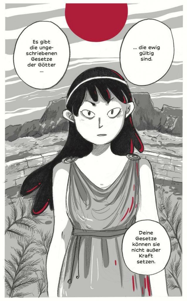 Vieweg rückt hier einen Konflikt in den Fokus, der in patriarchischen Gesellschaften noch heute so ausgetragen wird. Sophokles‘ Tragödie ist aktueller denn je, auch wenn Vieweg vor dem eigentlichen Ende abblendet. Aufschluss über Antigones letztliches Schicksal gibt dann ein Text im Anhang.