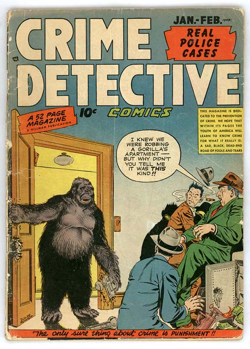 „Echte Polizeifälle“ schreit es vom Cover von CRIME DETECTIVE von Anfang 1949. Aber was für ein Fall mag das gewesen sein, in dem Räuber in einem Appartement sind und dann der dort lebende Gorilla zurückkommt? Naja, vielleicht war es ja einer jener Schauspieler, die darauf spezialisiert waren, in Film und Fernsehen in albernen Gorilla-Kostümen aufzutreten. Auf jeden Fall ein schräges Cover.