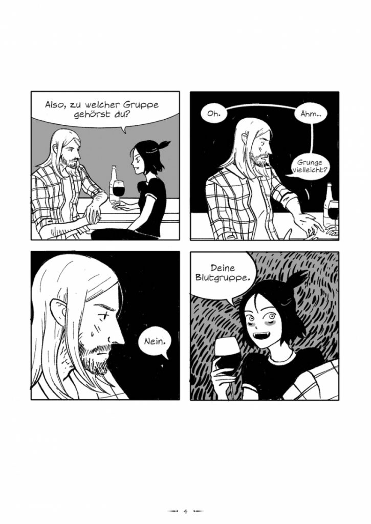 Der Humor bezieht sich aus der Unterschiedlichkeit der beiden Figuren. In der Beziehung ist FANGS eigentlich sogar sehr realistisch, nur dass die beiden Hauptfiguren Kreaturen der Nacht sind, macht dann doch etwas anderes daraus. Denn damit ist auch Humor möglich, der bei einer „normalen“ menschlichen Beziehung nicht machbar wäre. Und dann wiederum gibt es Seiten, bei denen ist es im Grunde völlig egal, ob Elsie und Jimmy nun Vampir und Werwolf sind. Hier wird ihr etwas anderer Zustand zur Metapher, fühlte sich jeder doch schon mal allein oder anders.