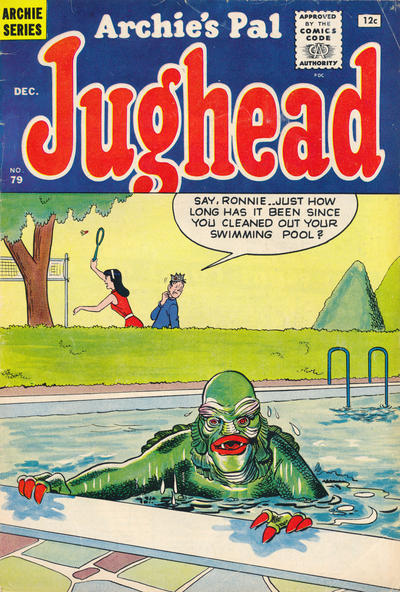 In ARCHIE’S PAL JUGHEAD 79 aus dem Jahr 1962 gibt es auf dem Cover ein monströses Cameo – der Schrecken vom Amazonas macht es sich im Swimming Pool gemütlich.