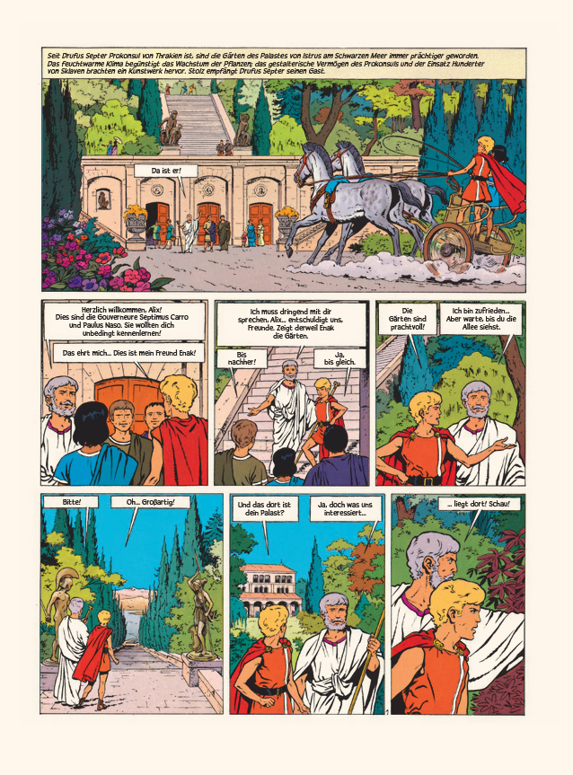 Das ist natürlich etwas für an Geschichte Interessierte, Fans der Comics kommen aber insofern auch auf ihre Kosten, weil es eine ganze Reihe Illustrationen gibt, die im Stil der ALIX-Comics gestaltet sind.