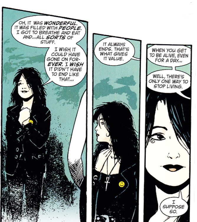 Wer nach der THE SANDMAN-Fernsehserie mehr über Death erfahren will, dem sei DEATH: DER PREIS DES LEBENS empfohlen. Hier erlebt der junge Sexton mit der leicht verrückten Didi eine Nacht , die alles ändert, die seine Einstellung zum Leben selbst verändert. Hegte der junge Mann zuvor noch einen Todeswunsch, so begrüßte er nach seinem Treffen mit Death das Leben als jenen wundervollen Wert, den es darstellt, egal, wie schwer es auch manchmal sein mag.