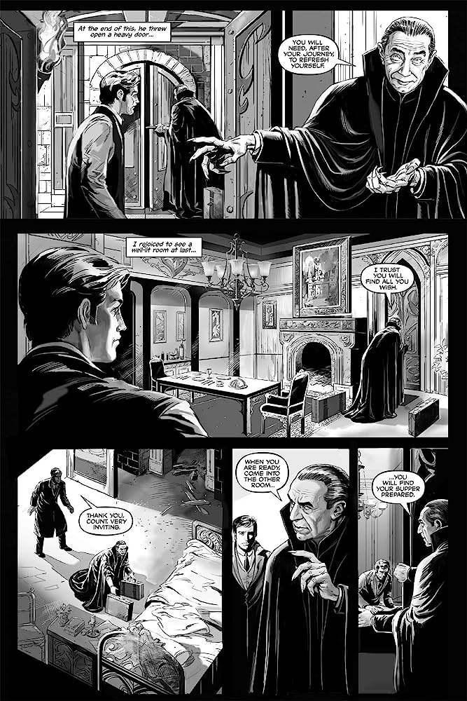 Denn der Clou dieser in Schwarzweiß gehaltenen Adaption des Romans ist, dass Dracula mit Bela Lugosis Antlitz gezeichnet wird. Sicherlich hat jeder seinen eigenen Favoriten, wenn es um die filmischen Versionen von Dracula geht, aber Lugosi war 1931 der erste, der der Figur auf der Leinwand Leben einhauchte. Und bis heute ist er einer der eindrucksvollsten Draculas. Tod Brownings Film war eher eine Adaption des Bühnenstücks als von Stokers Roman. Er musste viel kondensieren und weglassen. Mit diesem Comic hat man nun aber die Gelegenheit, Lugosi in einer werkgetreuen Adaption des Romans zu sehen.
