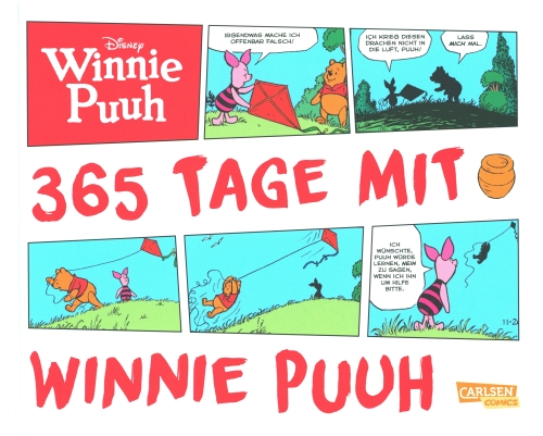 Für Kids jedes Alters hat Carlsen den wunderbaren 365 TAGE MIT WINNIE PUUH (35 Euro) veröffentlicht. Das ist ein schöner, querformatiger Band, der die Zeitungsstrips rund um den Bären mit dem Honigtopf versammelt. Die durchwegs farbigen Strips atmen den Geist der Disney-Filme und sind eher sanftmütig im Humor, aber immer unterhaltsam. Das Einzige, was man sich gewünscht hätte: ein leicht größeres Format. Das hätte den Strips (und der Schriftgröße in den Sprechblasen) schon gutgetan.
