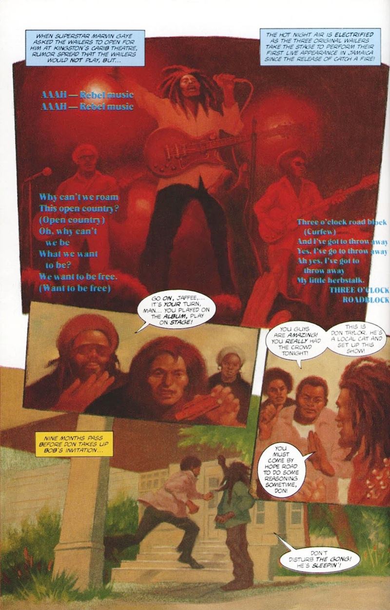 Es ging aber auch anders, wie Bob Marley: Tale of the Tuff Gong bewies. Verschiedene Kreative wie Charles E. Hall und Gene Colan waren an der Serie beteiligt, die im Großen und Ganzen die Lebensgeschichte des im Alter von nur 36 Jahren gestorbenen Sängers erzählte, wobei einige Textpassagen aus Marleys Song zum Einsatz kamen. Die erste Ausgabe hatte zudem ein Vorwort von Bono und eine Bonusgeschichte, die sich mit der Geschichte der Rasta in Jamaika auseinandersetzte.