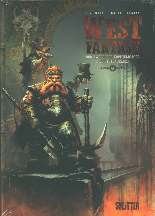 WEST FANTASY 1 (18 Euro) ist der Auftakt einer fünfbändigen Reihe, in der Okaar Albericht ein Zwerg ist, ein Goldsucher und schwer melancholisch. Eines verhängnisvollen Tages findet er in den Tiefen seiner Mine einen gigantischen Monolithen, ein von Magie durchdrungenes, mysteriöses Artefakt. Ohne es zu wissen, löst Okaar damit viele Tausend Meilen entfernt finstere Magie aus: Der Mann in Schwarz, ein uralter Nekromant, ersteht aus seinem Grab. Die Mixtur ist ungewöhnlich, aber funktioniert. Western und Fantasy ergeben hier ein erstaunlich homogenes Ganzes.