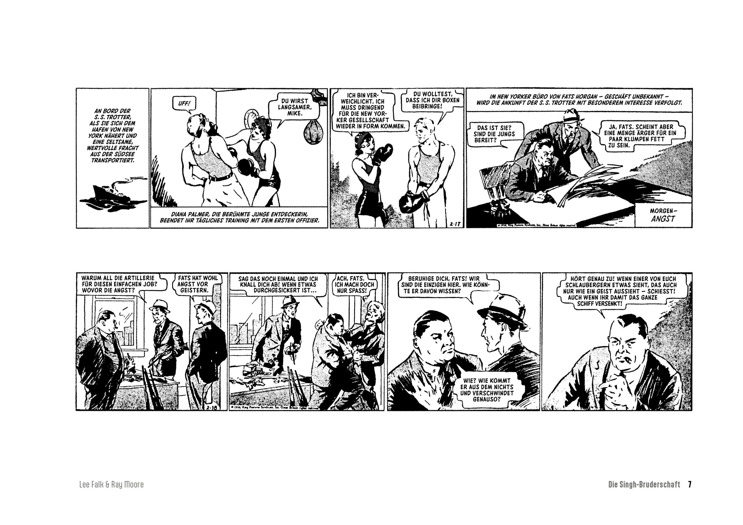 Die Reihe erscheint im Querformat und im Softcover. Auf jeder Seite sind zwei Tagesstreifen enthalten, die Reproduktion ist gut, allerdings wird im Vorwort auch schon angedeutet, dass es nicht leicht war, überall gleich gute Vorlagen zu finden. Die Geschichte „Die Singh-Bruderschaft“ ist insofern ungewöhnlich, weil man hier den Eindruck hat, dass Lee Falk eine andere Figur zum Phantom machen wollte. Darüber hinaus ist die Geschichte ein bisschen altbacken, aber das ist bei dem Alter auch zu erwarten. Vielleicht wäre Hardcover noch schöner gewesen, aber dennoch, hier wird eine weitere wichtige Phantom-Lücke geschlossen.