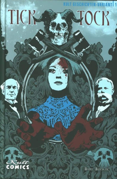 "Tick Tock". Von Michael Mikolajczak. Hardcover, 120 Seiten. Verlag Kult Comics. Variant-Ausgabe in einer Auflage von 50 Exemplaren mit 8 von den Künstlern signierten Exlibris in einer Mappe. / Was haben der Erfinder der Glühbirne und ein auf dem elektrischen Stuhl hingerichteter Mörder gemein? Die Antwort zeichnet Paolo Massagli in der abgründigen Geschichte DAS VERMÄCHTNIS DES HERRN EDISON. Ist es möglich, eine Wespe in eine Auftragskillerin zu verwandeln? Holger Klein visualisiert die verblüffende Antwort in der dramatischen Story KÖNIGINNEN. Wie konnte aus einem untalentierten Gitarristen ein begnadetes Musik-Genie werden? Ernesto ›Erggo‹ Rodriguez illustriert in der DER TEUFEL UND ICH die phantastische Wahrheit einer mysteriösen Verwandlung. Warum sehen Erwachsene so oft weg und verweigern Hilfe, wenn Kinder in Gefahr sind? Christian ›Zano‹ Zanotelli versucht sich in der preisgekrönten Geschichte HÄNSELS REISE an einer erschreckenden Erklärung. Warum kann das Tragen einer Atemschutzmaske Menschen verändern? Erik van Schoor entwirft in SMILEY eine beklemmende und vielleicht nahe Zukunft der Menschheit. Warum sollte Andy Warhol am 03.07.1968 sterben? Sascha Dörp liefert in S.C.U.M. einen zeichnerischen Einblick in ein dunkles Kapitel der Pop Art. Kann ein Virus gewöhnliche Menschen zu Superhelden und Schurken mutieren lassen? Chris W. Jany erschafft in düsteren Graustufen eine Heldengeschichte der anderen Art: DER FLUCH DER FLEDERMAUS. Warum fürchtet eine alte Frau nichts mehr auf der Welt, als lebendig begraben zu werden? Jacek Piotrowski enthüllt in TICK TOCK das finstere Geheimnis einer wahren Geschichte. Willkommen in der Gedankenwelt von KULT GESCHICHTEN. Willkommen im Story-Universum des MICHAEL MIKOLAJCZAK.
